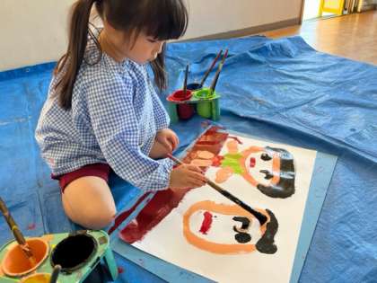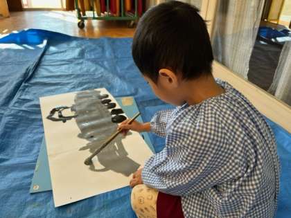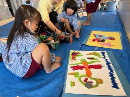 好きなものや楽しかったことを絵の具を使って表現していきました。すぐにかき進められる子どももいましたが、どんな事をかこうかと、友達がかいている横でじっと考えている子どももいました。考えていた子どももあれこれ話して決まると、どんどんとかき進めていきました。子どもたちの考えていることがあふれてきていました。