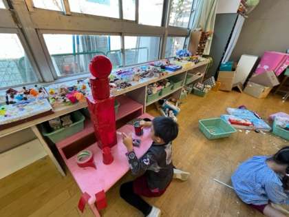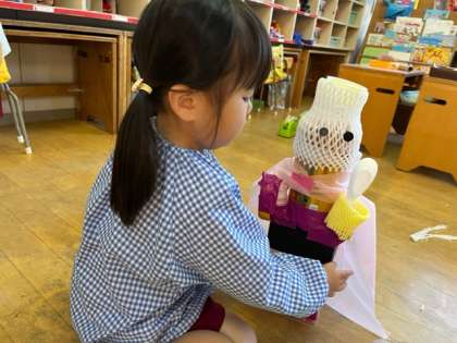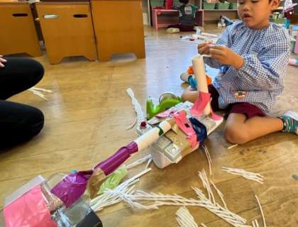 1学期から作るのが大好きなあか組の子どもたち。「これ使いたい」「これ、いいかも!」と、どんどんと思いが膨らんでいきます。思いの詰まった作品が少しずつできていきますね。