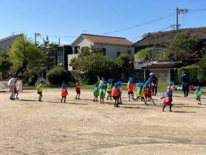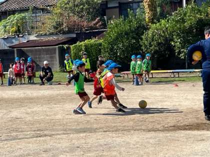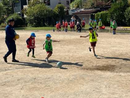 とても楽しみにしていたあお組、元気に園庭に飛び出してきました。広い園庭を走り回って、ボールを追いかけていました。あお組は試合形式でしたり、ゲーム感覚で楽しんでいました。