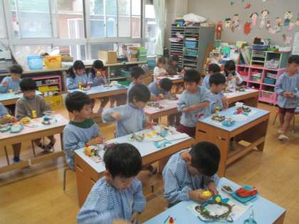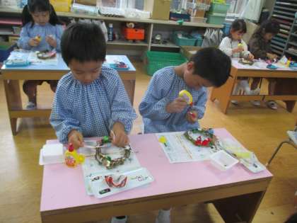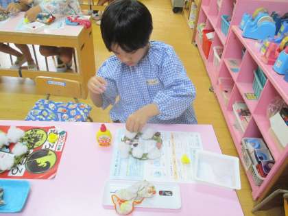 「かわいくできた」「リボンとかキラキラにした」と好きな飾りを選んで構成し、喜んでいたあお組。どんな風に飾ろうかな、楽しみだね。
