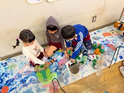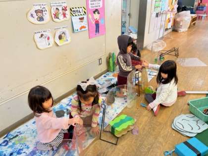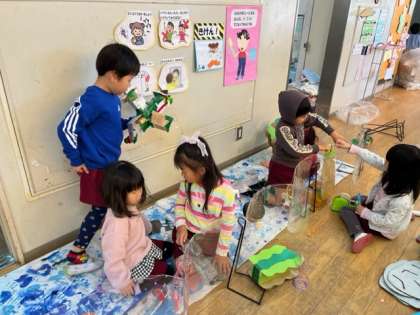 海の世界の生き物を作ろうと数人と作り始めました。魚を作っていましたが、「水槽みたいにしたらいい」「でも透明じゃないと魚が見えない」ということで、透明パネルを水槽にして海の世界を作り始めました。すると、「私もやりたい」とたくさんの子どもたちが集まって来て、魚やタツノオトシゴ、サメ、クラゲ、ペンギンといろいろな海の生き物ができてきました。「もっと作るわ」「ここ飾ったらいいと思うと思い思いに作っていました。