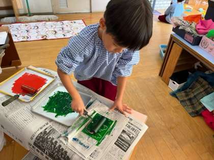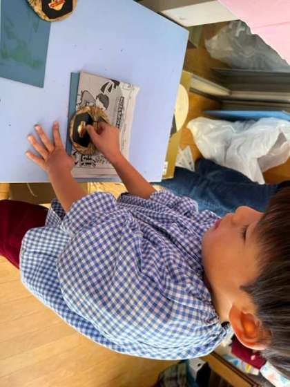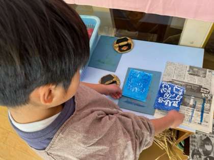 干支の辰をスチレン板に書いて、版画をしました。自分のかいた絵がもう一枚できて、びっくりしていました。来年のカレンダーに貼って、飾りたいと思います。子ども展覧会に飾りますので、楽しみにしておいてください。