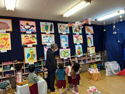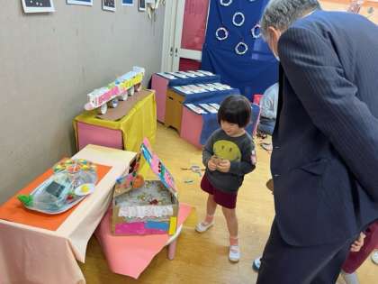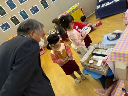 もも組の子どもたちは大喜びで、自分の作ったものを見てもらいたくて、「これはな、お家」「キリンつくってんで」「見て見て!」と次々に手を引っ張っていき、話をしていました。褒めてもらっている友達を見て、校長先生取り合うように話をしていました。たくさん褒めていただき、自信いっぱいになったもも組の子どもたち、次はお家の方にもたくさん話をしていくと思います。