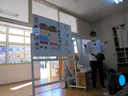 最後に、「かぜよぼうのあいことば」として、「てあらいうがい」「はやねはやおき」「ごはんをたくさんたべる」「からだをうごかす、そとであそぶ」を知らせると、「まもれるよ!」「全部できてるから、僕風邪ひかないよ!」と自信満々な様子が見られました。