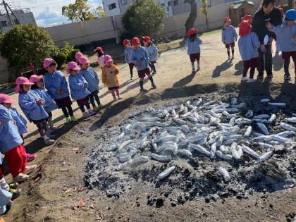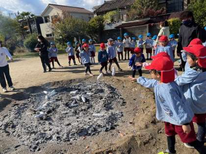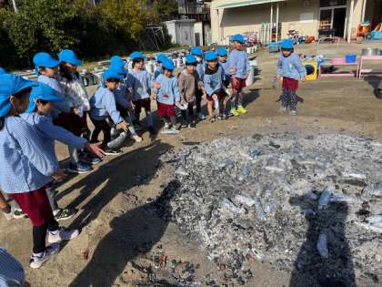 みんなで集めた園庭の落ち葉や木材を燃やして作った熱々の灰の中においもを入れました。「美味しくなあれ」と大きな声で呼びかけたり、自然と歌をうたったりしていました。