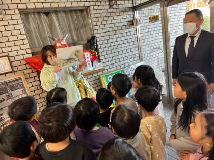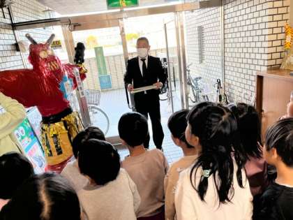 住吉大社さんの御田で、頑張っていたかかしが戻ってきました。感謝状と来年の干支の絵をいただきました。地域の住吉大社さんに見守っていただいていることを子どもたちも感じていたようでした。「地域の方にカレンダーを作ってるな、渡す?」と話す子どももいました。