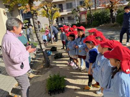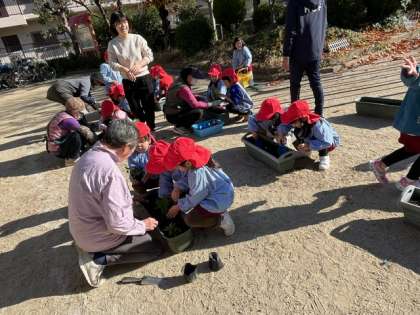 「もも組の時も一緒に植えたのかな」と言っていただき、子どもたちとの再会を喜んでくださいました。ていねいにポットから取り出して、植えました。「お水いっぱいあげないと」とジョウロで水をあげていました。
