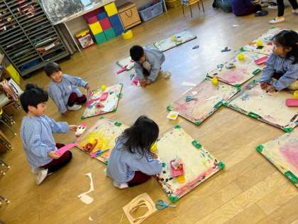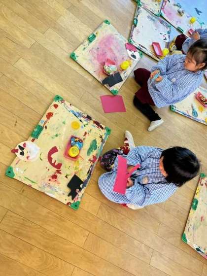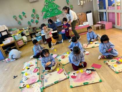 「サンタさん、おひげあるやろ」と見せてくれました。部屋に音楽が流れ、みんな笑顔で、楽しい雰囲気で製作を楽しんでいました。