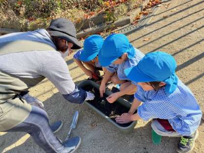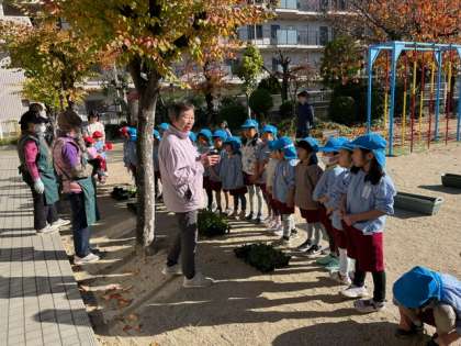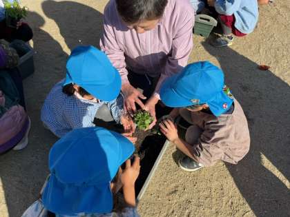 ポットからの植え替えを何度もしてきたあお組は、「ここに植えようか」「チョキにして」「穴を開けて」「やさしく土の布団をかけて」と自分たちで進めていました。