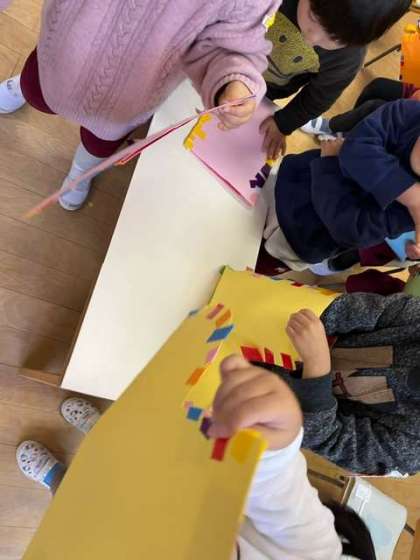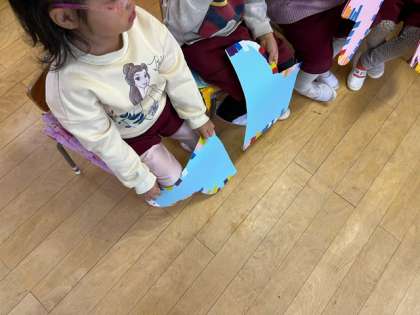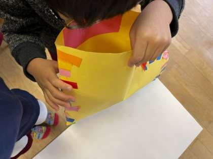 靴下を作りました。自分の好きな色の靴下に、いろいろな色のテープを貼り、プレゼントを入れても落ちないかを確かめて、落ちそうな時はまたテープを貼っていました。「落ちないよ」と見せてくれました。
