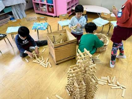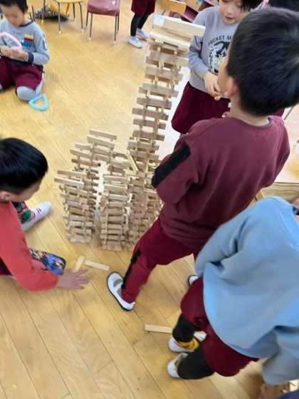 友達と一緒にカプラで遊びました。どんどんと積み上げていくと、面白い形になっていきました。1人よりもみんなで力を合わせて遊ぶと楽しくなりました。