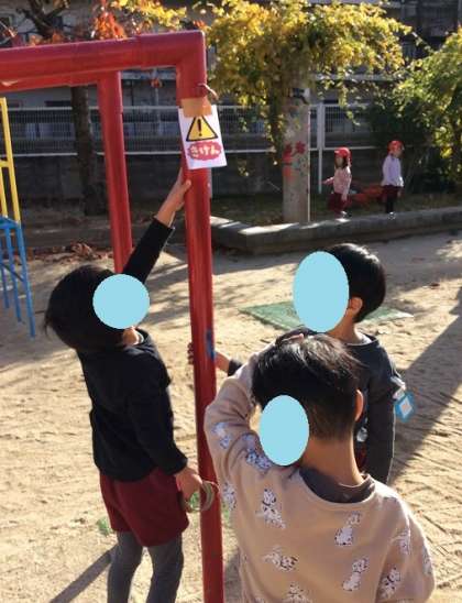 次に、幼稚園の中のけがをしやすい場所やけがをしたことがある場所を見つける活動をしました。友達同士で協力して危ない場所を探し、最後に見つけた場所を知らせ合いました。