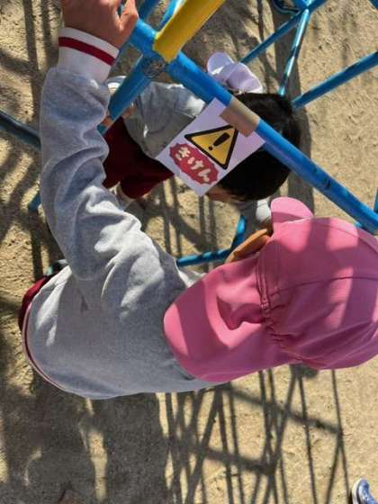 あお組が保健指導で「きけん!」印をつけていたと、もも組が教えてくれました。「気をつけないとあかんねん、頭をゴツンッてなるやろ」「こうやって行かなあかんねん」と実演して見せてくれました。