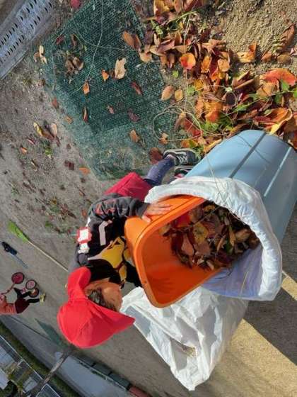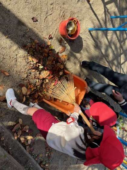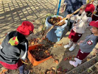 「昨日もやったけど、手伝おうか?」と、自分から手伝いにきてくれました。たくさんの落ち葉を「重いな」と言いながら袋に詰めてくれました。園庭の花壇付近がきれいになりました。