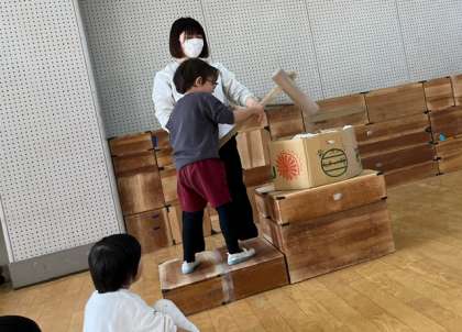 本物のきねを持ってみました。「重い」と言いながら、つく練習をしました。友達が応援してくれる中で、きねをしっかりと持ってついていました。はやく本物のおもちをつきたいな。