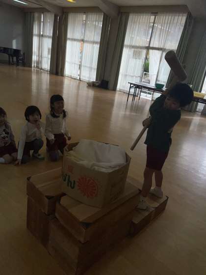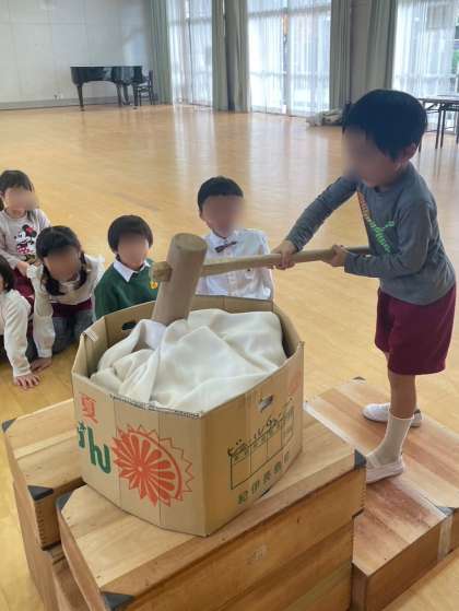 あお組は、5歳の子どもなので、5回つきます。友達がつく様子をみんなで数えながら、美味しいおもちができるようにと応援しました。