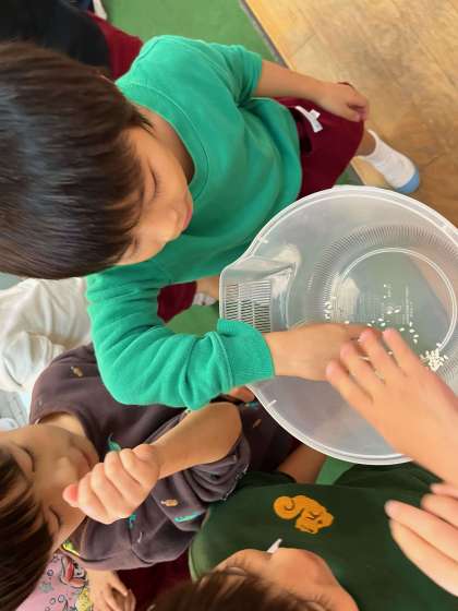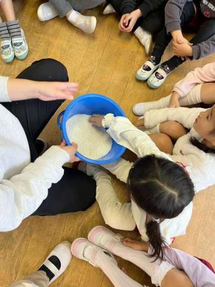 もち米って「お弁当に入ってるご飯見たいかな?」と触ってみました。「あれ?硬い」「おにぎりは柔らかいのに」と言いながら触って、ビックリ!していました。「小さいしな」と不思議そうにしていました。稲穂から取り出したお米と比べてみると、「大きさが違う」「色も違うな」と見比べていました。