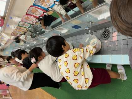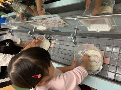 「お手伝いしてるから」と言っていた子どもは上手にお米を洗っていました。「お水を入れてから捨てるんやんな」「お水無くなったから洗うよ」ときれいにお米を洗いました。
