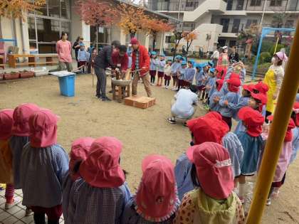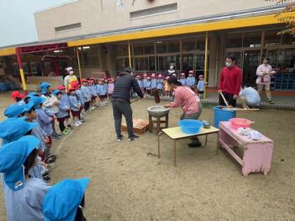 一臼目は、幼稚園用の大きな鏡もちにしました。つき手のお父さんたちに、蒸し上がった米を潰して、ついてもらい、お母さん方や先生達が大きな鏡もちに丸めました。「お米が丸くなってる」「触ってみたい」と、次に自分たちがついたり丸めたりするのを楽しみにしていました。