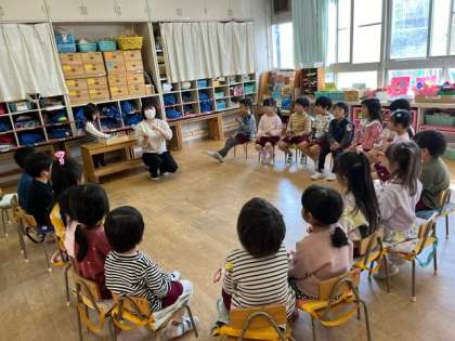 カスタネットで、先生が名前を呼んで、返事をしました。「○○さん」「はあい」と返事をしたり、いろいろなフルーツを鳴らしたりしてみました。1人ずつでも緊張せず、リズムがとれるようになってきました。
