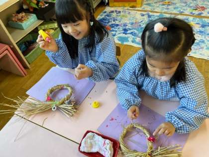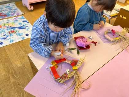 あお組が飾っていたしめ縄の飾り付けをあか組もしました。和風の飾りから「どれにしようかな」と好きなものを選んで、配置を考えながら、貼っていました。
