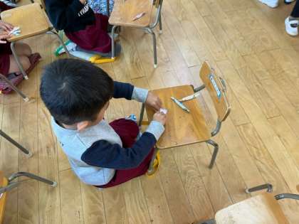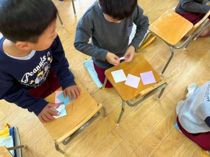 折り紙をくるくるとして折り、重ねると、雪の結晶をつくりました。出来上がったら、また飾ります。