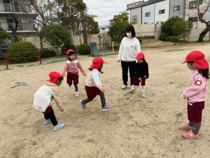 友達同士で縄を動かしながら、「1枚、2枚…」と跳ぶ回数を数えて、何度も挑戦していました。友達と励まされて、タイミングを合わせて跳んだり、縄を動かしたり、友達の跳ぶ様子を見て挑戦してみたいとイメージしていたり、それぞれの遊び方があり、楽しんでいました。
