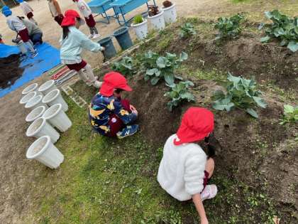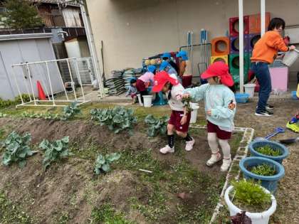 ブロッコリーやそら豆を植えた畑の雑草をあか組が3人で抜いて、「私たちで考えて、雑草抜いてるねん」「○○先生には教えんといてな、サプライズやから」と雑草を集めていた。「こんなのが雑草やから抜いて!」「この前もとったんやけど、すぐ出てくるねん」「全部取るから、明日もしような、先生もやろうな」「私たちで育ててるんやで、雑草抜いて、いっぱいできたらいいな」「100個くらいできたらみんなで分けような」と一生懸命に抜いていた。片付け後、担任の○○先生に知らせて、驚かせて喜んでいました。