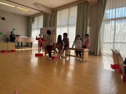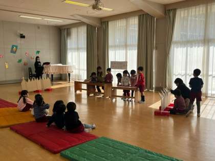 「パン屋さんになってパン作る」「何パンがいいかな」「チョコパンがいいなぁ」と言いながら、パンを作る表現をしたり、「看板をどこに置いたらいいかな」とみんなで考えたりしています。「そこは顔が見えへん」「後ろがいいと思う」などと考えて、見合いっこをしています。