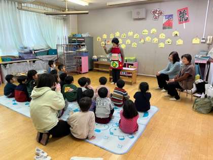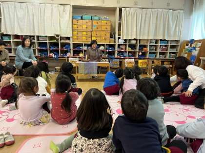 手遊び、絵本、紙芝居、素話、エプロンシアターと楽しい演出で、子どもたちは長時間楽しんでお話を聞いていました。
