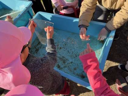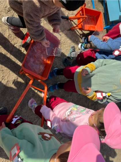 園庭のたらいや池では氷が張り、子どもたちが大喜びで「冷たい」と言いながら、持って友達に見せたり、手押し車に集めたりしていました。