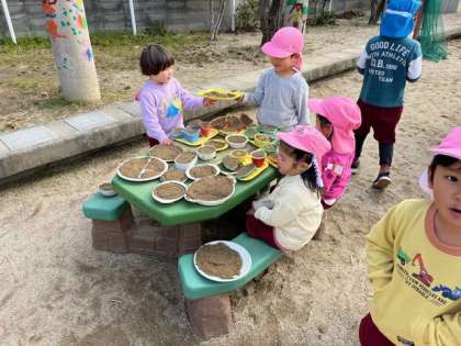 ごちそういっぱい 公開日 2024/01/19 更新日 2024/01/19 園の様子 もも組は友達と一緒に遊ぶことが楽しくなってきていて、砂場でたくさんごちそうをつくって、招待してくれました。 いいね(0)