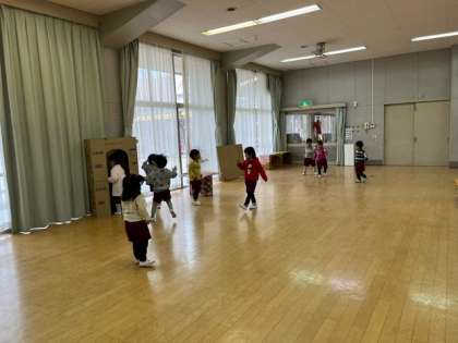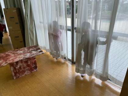 「ここに隠れたらオオカミに見つからない」「どこに隠れようか?」とごっこ遊びを楽しんでいます。