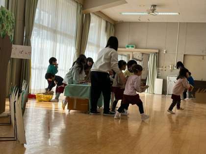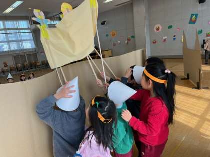 それぞれのクラスで、「どんな役したい?」「なんて言ったら分かるかな?」「どんなふうにしたら、楽しくなるかな?」「どうしたらじゅうたんに乗ってるように見える?」と、友達と一緒に考えながら、進めています。なかなか進みませんが楽しんで考えて、楽しんでいます。