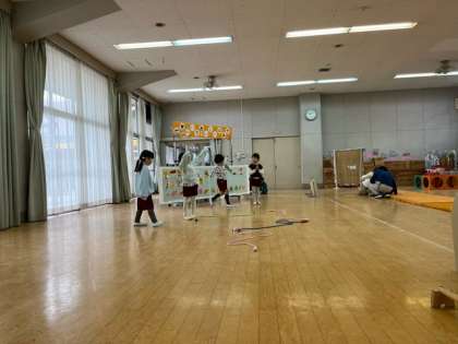 ゴリラのパン屋さんごっこをして遊びました。なわを使って綱渡りごっこをしたり、一本歯下駄をしたりしながら、普段から幼稚園で遊んでいることを取り入れて、遊んでいます。どんな劇遊びになるでしょうね。