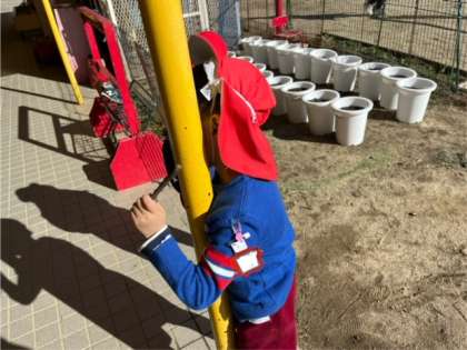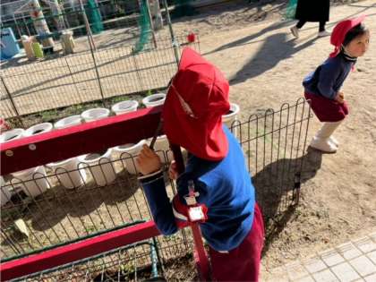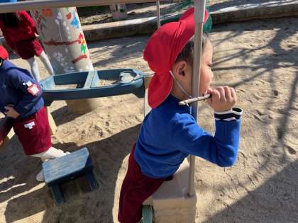園庭で見つけた木の枝でいろいろなところを叩いてみると、違う音がすることに気がつきました。「これはどんな音がするかな」と耳を当てて試してみました。「コンコンっていってる」と聞いていました。