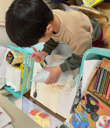 自分の模様付けや小道具を自分で作りました。ストーリーが決まってきて、自分に必要なものが決まってきて、作っています。どんな劇になっていくのか、楽しみですね。