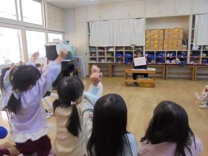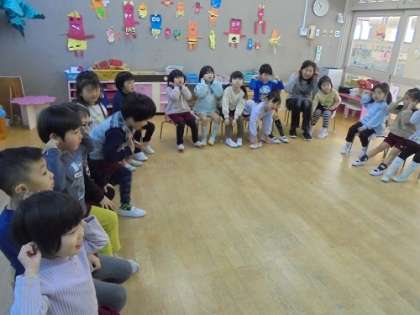 最後に、もうすぐ年長に進級することを話し、大きくなるためには、「よくたべる、よくねる、よくあそぶ」が大切であることを知らせました。