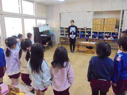 あか組に保健指導を行いました。骨の不思議と成長について、クイズを出しながら話しました。