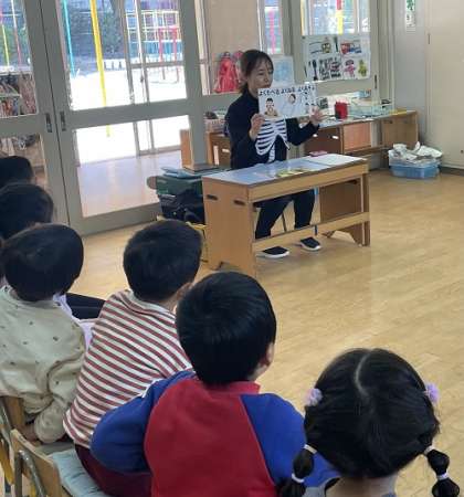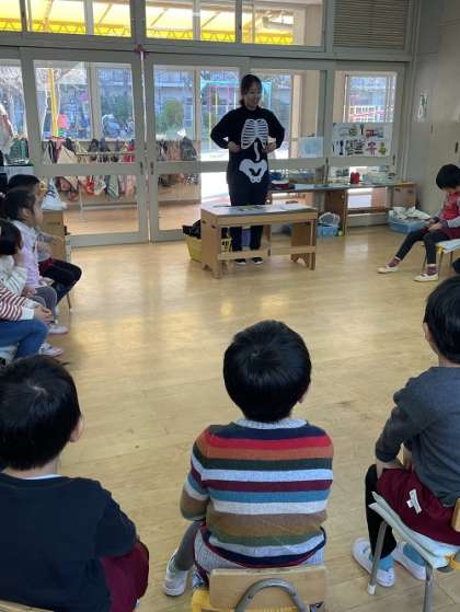 保健指導の後には、幼稚園にある骨の絵本を読む子どもたちの姿が見られました。