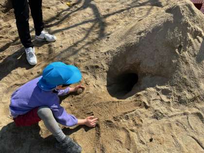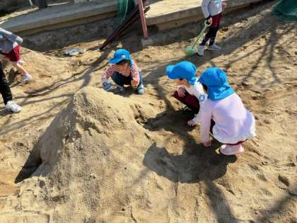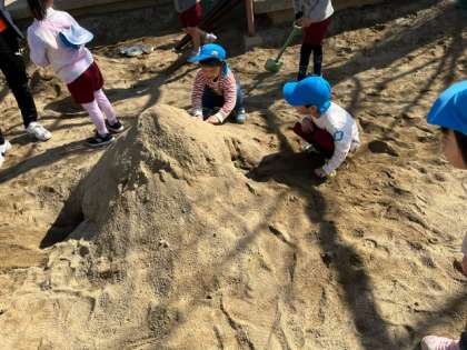 砂場に大きな穴ができてきました。両側から開けていっているので、「もうすぐつながりそうなんだけどな」と言って、穴を覗き込んでいました。つながるといいのにね。楽しみですね。