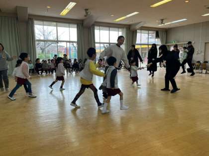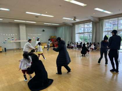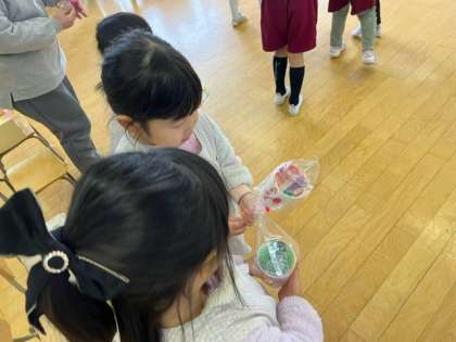 お花が飛び出すプレゼントをもらい、嬉しそうに見せ合っていました。お家の人と「こちょばしあいっこ」の遊びをして楽しみました。最後は全員で、『誕生月仲間』で1年間でみんな誕生日がきたことを喜びました。