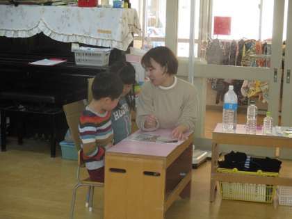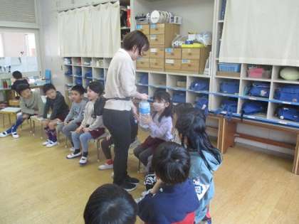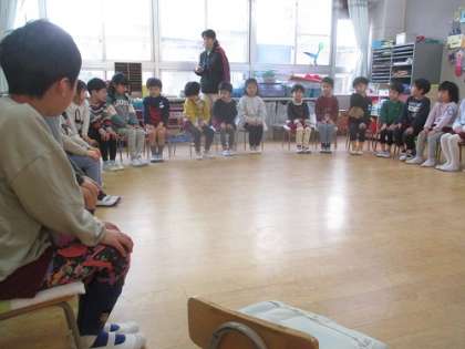 保健指導では、修了式でかっこよく座るために、また、4月から小学生となり、よい姿勢で授業が受けられるようになるために、「すわったときのよい姿勢」について話しました。最初に、子どもの頭と同じくらいの重さである、水が入った2Lのペットボトルを持ってみて、「悪い姿勢の時にこの重さがずっと首の上に乗っていたらどう?」と聞くと、「重い!」「苦しそう」と言い、よい姿勢の大切さを知ることができました。次に、「せなかピン!足はピタ!手はおひざ!」の姿勢が良いと知らせると、話を聞いた途端にだんだんと子どもたちの姿勢が良くなっていきました。勉強や食事で机があるときの姿勢も練習し、かっこいい小学生になるための準備をしました。