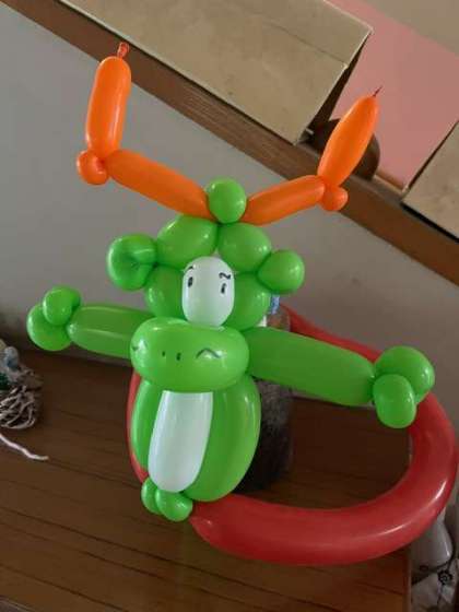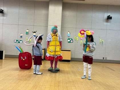 お別れ会の締めくくりにピエロさんが遊びにきてくれました。クラウンマサミさんのバルーンショーをみんなで見ました。ピエロさんは細長いバルーンを次々と変身させていきました。あお組がピエロさんの助手となってお手伝いをしたり、バルーンを使ったクイズやバルーンで遊ぶなど、楽しいショーでした。今年の干支の辰を幼稚園にいただき、子どもたちは空に飛び上がるネズミのバルーンをプレゼントにもらいました。