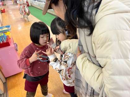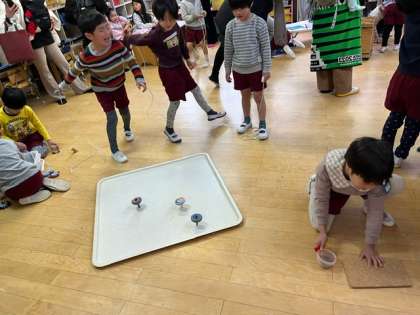 普段の子どもたちの姿を見ていただきたいと思い、参観を行いました。子どもたちは思い思いの遊びを楽しんでいました。普段通りの子どもたちの姿があふれ、最近頑張っているあやとりやこま回しなどに一生懸命でした。