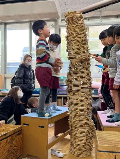 あお組はカプラを積み上げ、どんどんと高くなり、みんなで倒れそうな状況でヒヤヒヤしながら、楽しみ、保護者の方も一緒に見守っておられました。