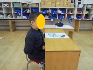 次に、机があるときのよい姿勢を知らせ、一人ずつ実践してみました。順番が来るまでによい姿勢の練習をしたり、友達の座っているところを見て、「かっこいい!」「小学生みたい!」とほめあっていました。
