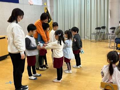 お別れ会の日にお休みしていたあお組に修了を記念して作ったプレゼントを渡しました。学校に行って字を書くことが多くなるので、鉛筆を入れられる鉛筆立てを「頑張ってね」という気持ちを込めて渡しました