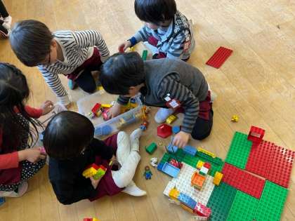 ブロックで恐竜やお家をつくり、「今日は寒いからお家に入れてあげなくっちゃなくちゃ」と、友達と話ながら遊んでいました。カプラでは倒れないように積み上げていっていました。