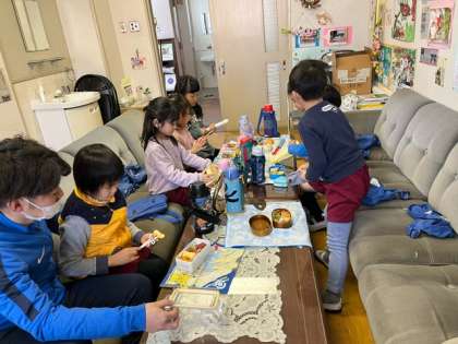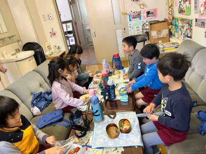 最後まで待っていたチームが園長室にお弁当を食べにやってきました。みんなで大笑いしながら食べ、「幼稚園は楽しかったな」「小学校に行くから、大きくなる」といろいろな話をして盛り上がりました。